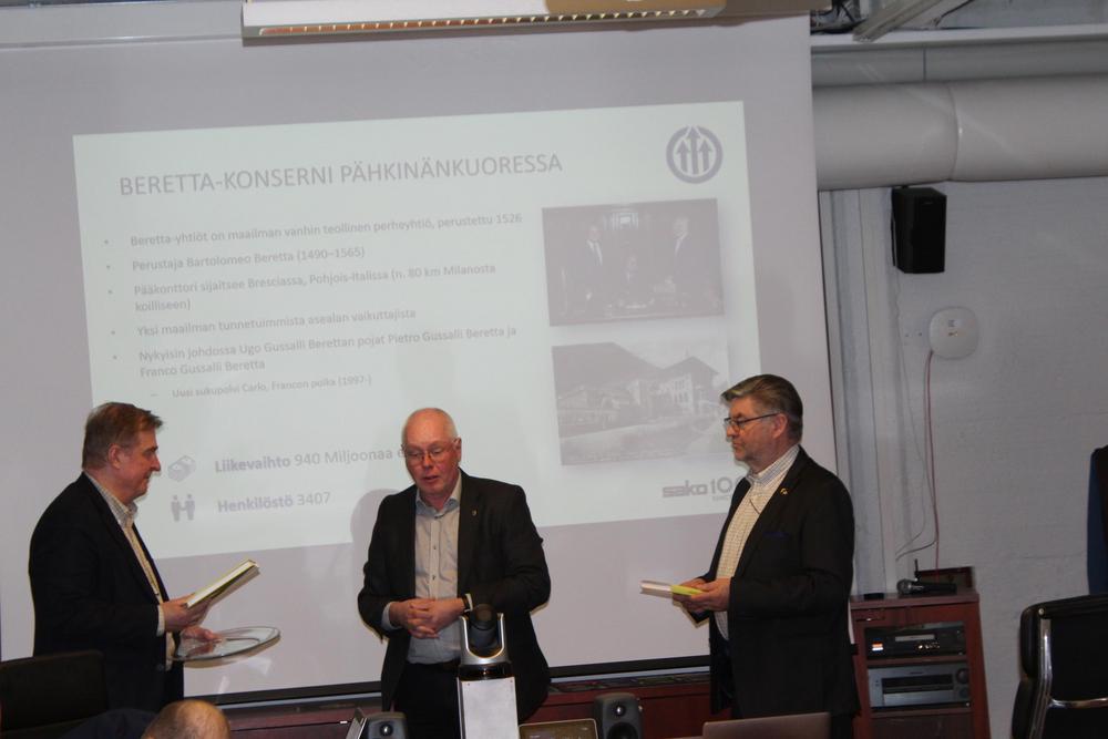 Sako oli sotien jälkeen myös Suomen Punaisen Ristin omistama yritys. Liikevaihto on 137Me. Sakon tukijalkoina ovat avoimuus, laatu, hyvät tekijät. Lähitulevaisuudessa Sako saattaa olla myös merkittävä eurooppalainen patruunavalmistaja, mikäli kilpailuviranomaiset hyväksyvät suunnitelmat. Yhtiötä esittelivät toimitusjohtaja Raimo Karjalainen ja senior advicer Kari Kuparinen, joka on tehnyt pitkän ja ansiokkaan uran Sakon tuotekehityksessa. Sakon päätuotteita ovat kivääriaseet, joiden totantomäärät ovat nousseet 20 000 kappaleesta nykyiseen tavoitteeseen 170 000 kappaletta vuodessa.